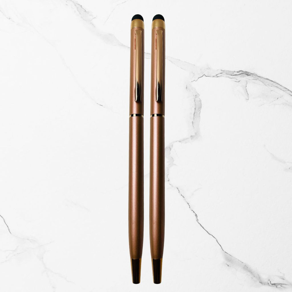 These pens blend style, comfort, and performance. With their metallic shine and sophisticated rose-gold detailing, they make the perfect accessory for work, study, and daily writing needs. The stylus tip adds functionality for mobiles, tablets, and touch-screen devices, making multitasking easier.