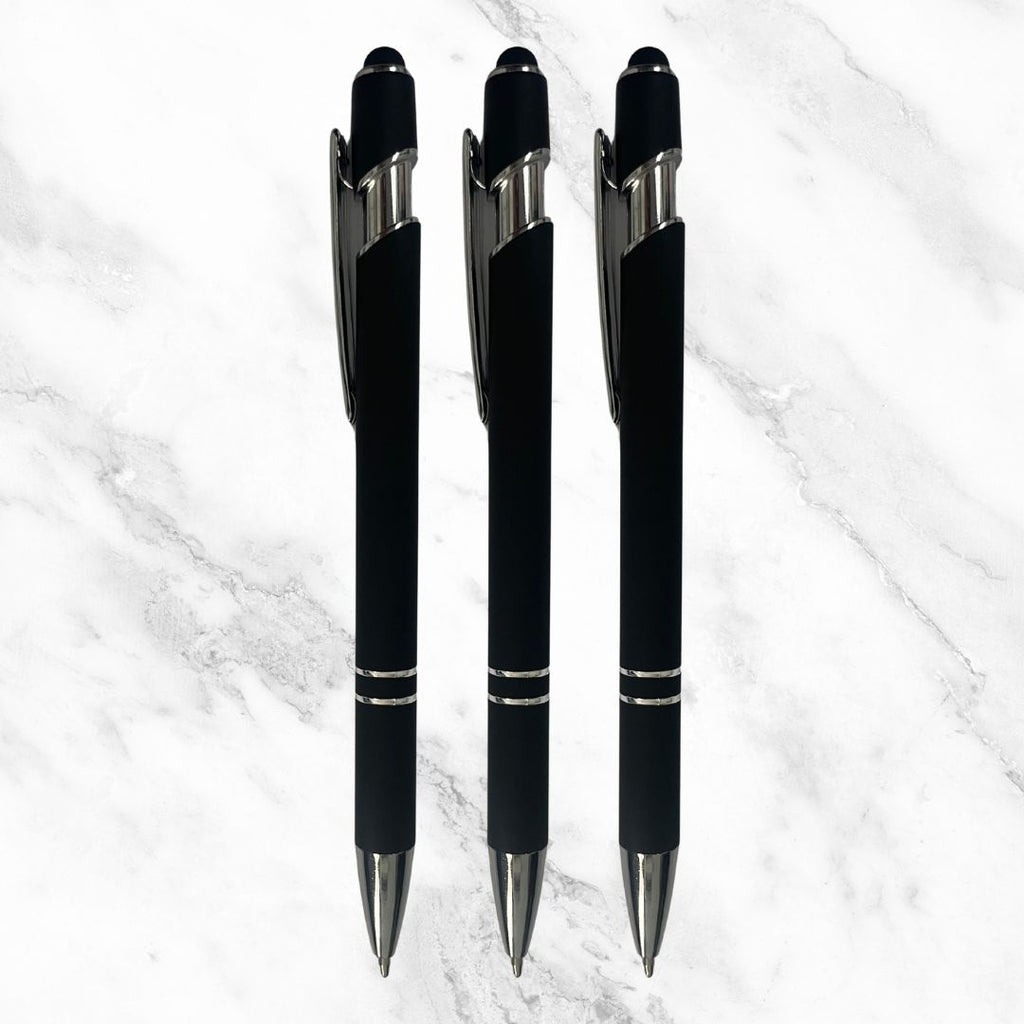 Upgrade your writing essentials with this premium Set of 3 Matte Black Ball Pens designed for professionals, students, and tech-savvy users. Crafted with a sleek matte black finish and elegant silver clip, these pens exude class and utility. The stylus mobile touch tip makes them perfect for seamless navigation on smartphones and tablets. Featuring a smooth click mechanism and blue ink flow, they deliver consistent writing with minimal pressure. Whether you're jotting down notes or signing documents, these pens offer a balance of performance and style — in one smart, value-packed trio.