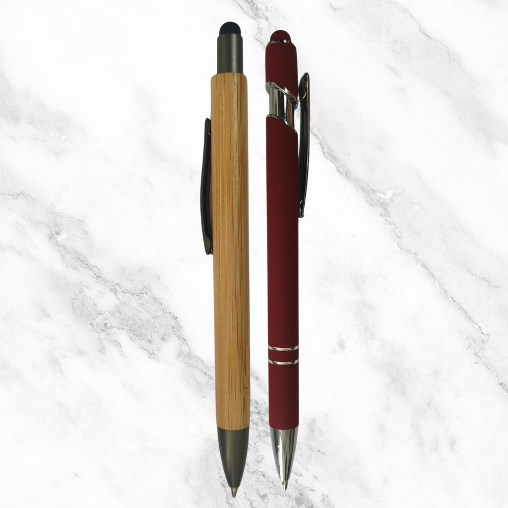 Upgrade your writing and tech experience with this elegant Set of 2 Stylus Ball Pens, featuring one with a wooden finish body and the other in a matte maroon finish, both complemented by a sleek silver clip. Designed for modern multitaskers, these pens combine smooth blue ink ballpoint writing with mobile touch screen compatibility, thanks to the built-in stylus tips.