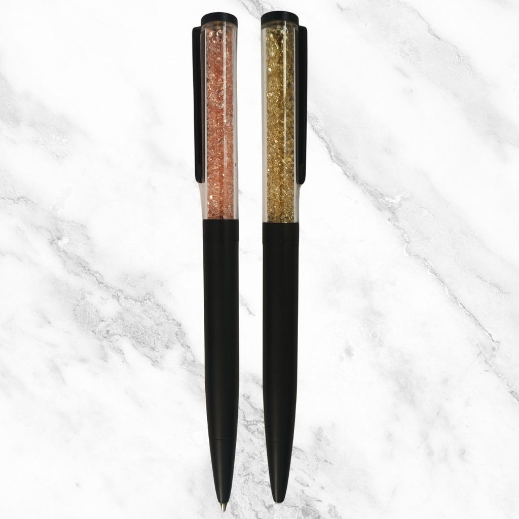 Includes two premium pens with matte black finishes—one with a gold crystal top, the other with a pink crystal top for added charm and diversity. -
