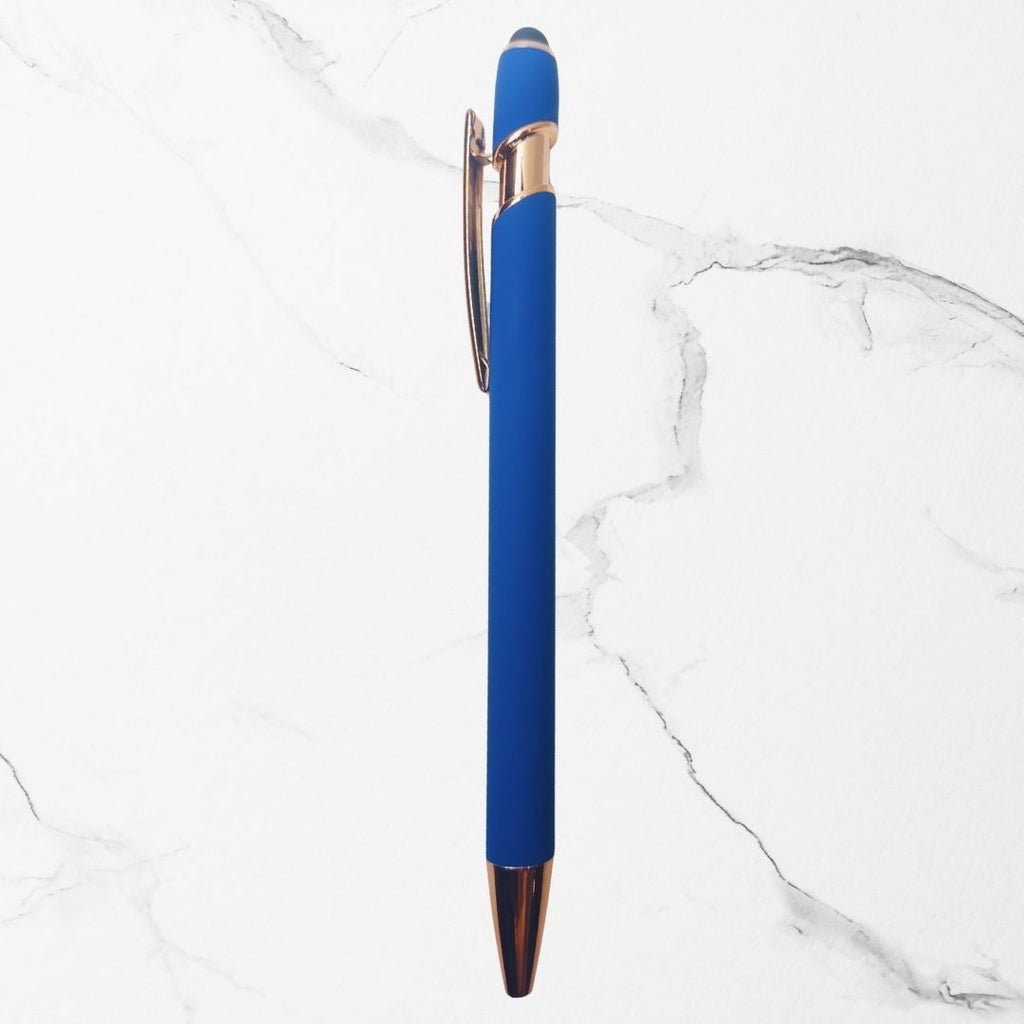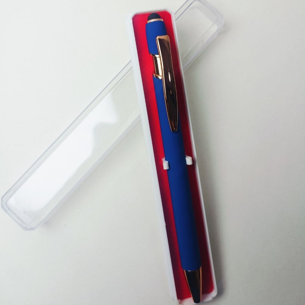 This Set of 4 Premium Stylus Ball Pens combines matte blue and rose gold finishes with a stylish rose gold clip, making it an ideal couple gift, romantic surprise, or thoughtful keepsake.