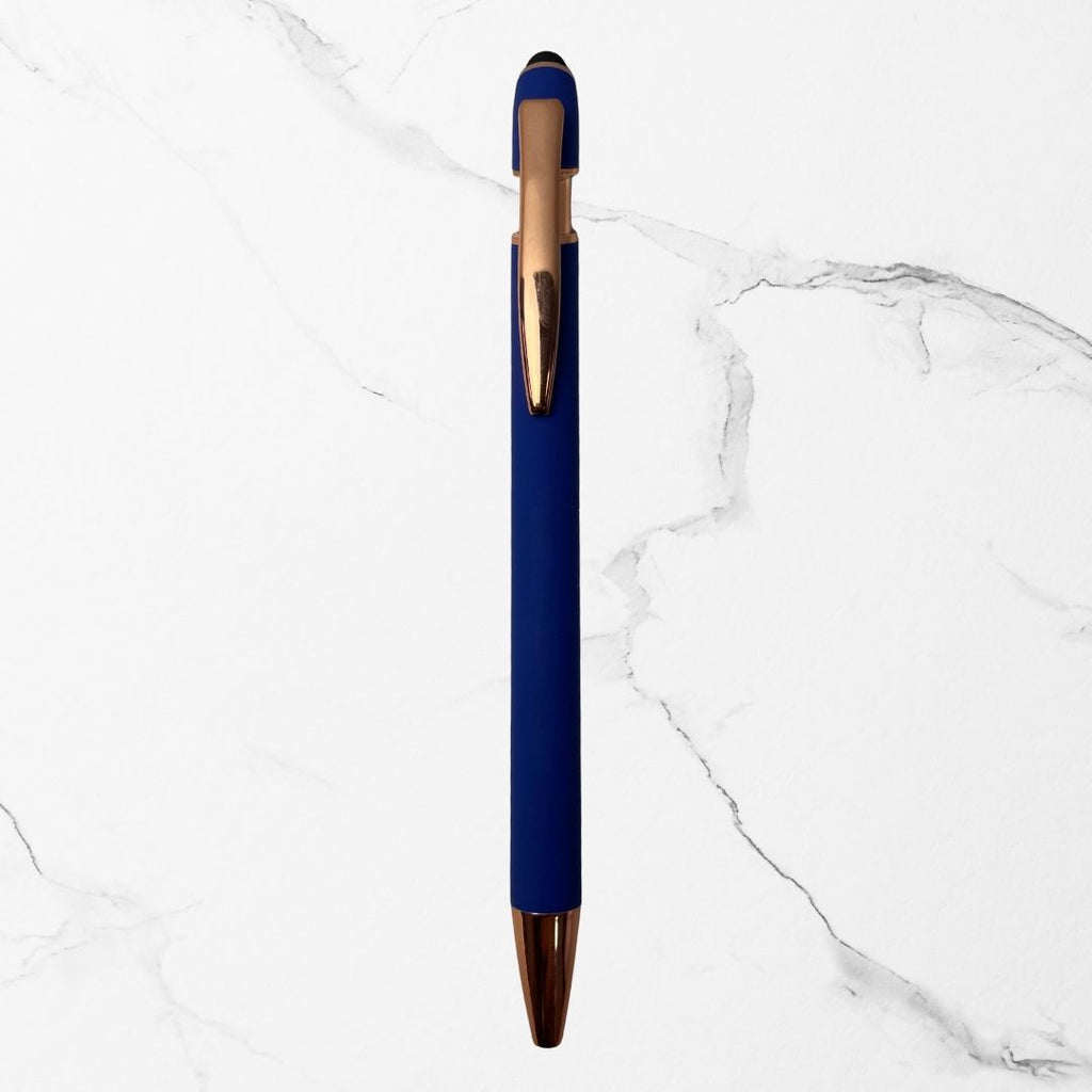 2 Stylus Matte Blue Ball Pens with elegant glossy copper clips, perfect for modern users who switch between paper and touchscreen devices.