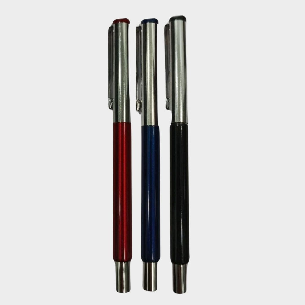 This Combo of 3 Ball Pens includes three essential shades—metallic red, metallic blue, and glossy black—each fitted with a durable silver openable cap. Designed for smooth writing and a polished look, these pens use 0.6mm blue ink refills that offer clean, consistent strokes. Ideal for school, office, or home use, they combine functionality with a stylish edge.